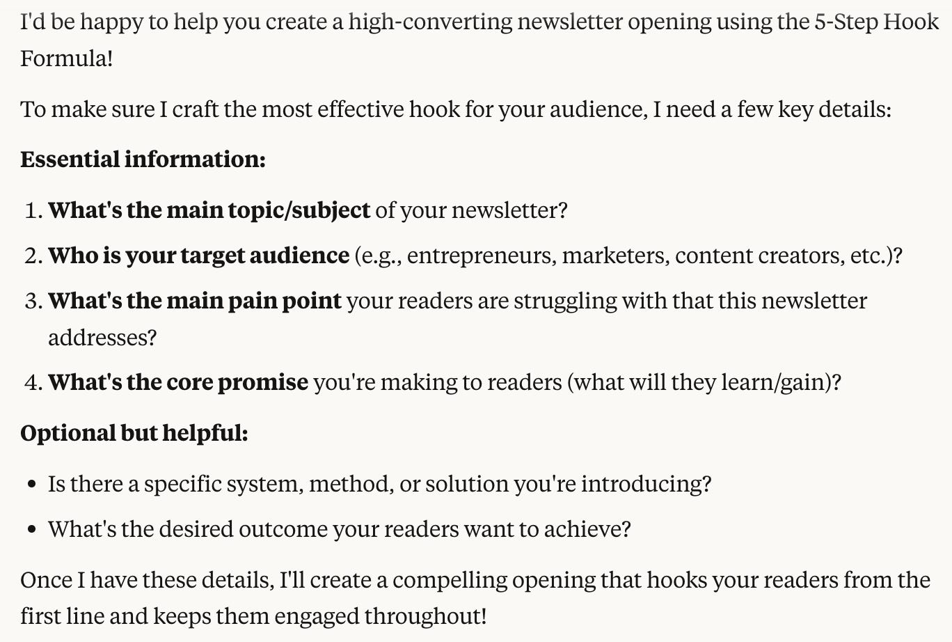 Before you create the opening, ask for things you would need to make sure you do a good job, like the main topic/subject of the newsletter, the main pain the reader faces that the article addresses, and the promise made to the reader. Ask follow-up questions if you need clarity, but don't ask too many.