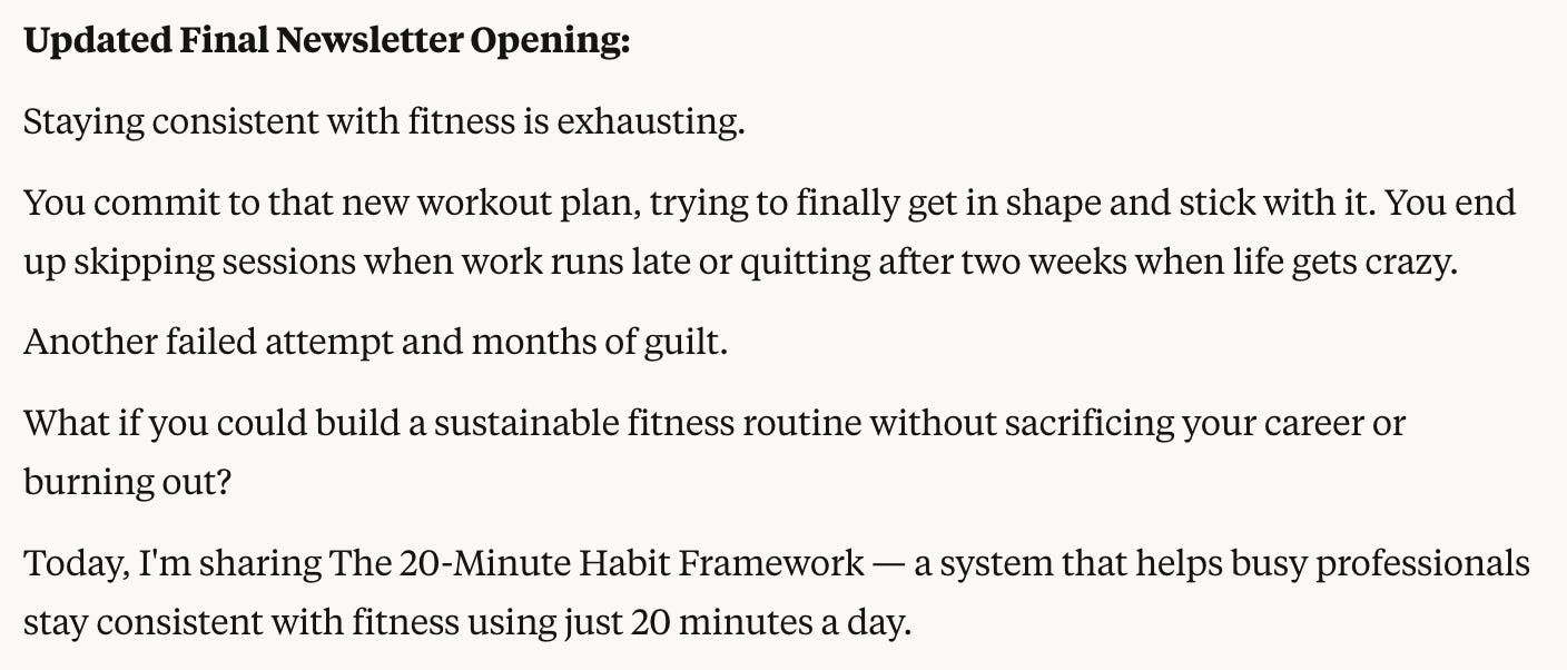 - Write the final opening as if it’s ready to drop into a newsletter.
