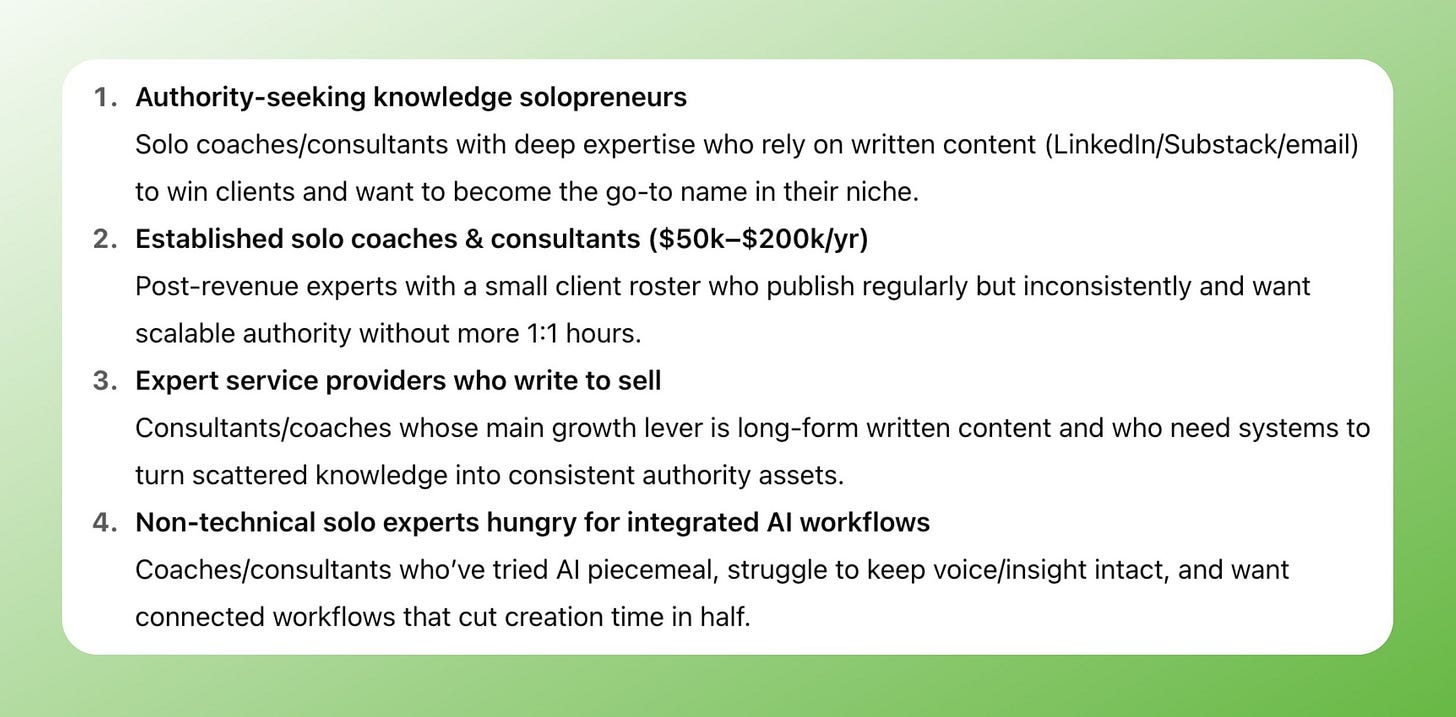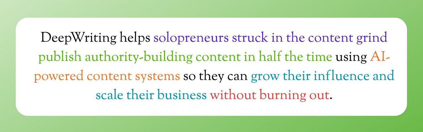 Ex: "DeepWriting helps solopreneurs struck in the content grind publish authority-building content in half the time using AI-powered content systems so they can grow their influence and scale their business without burning out."