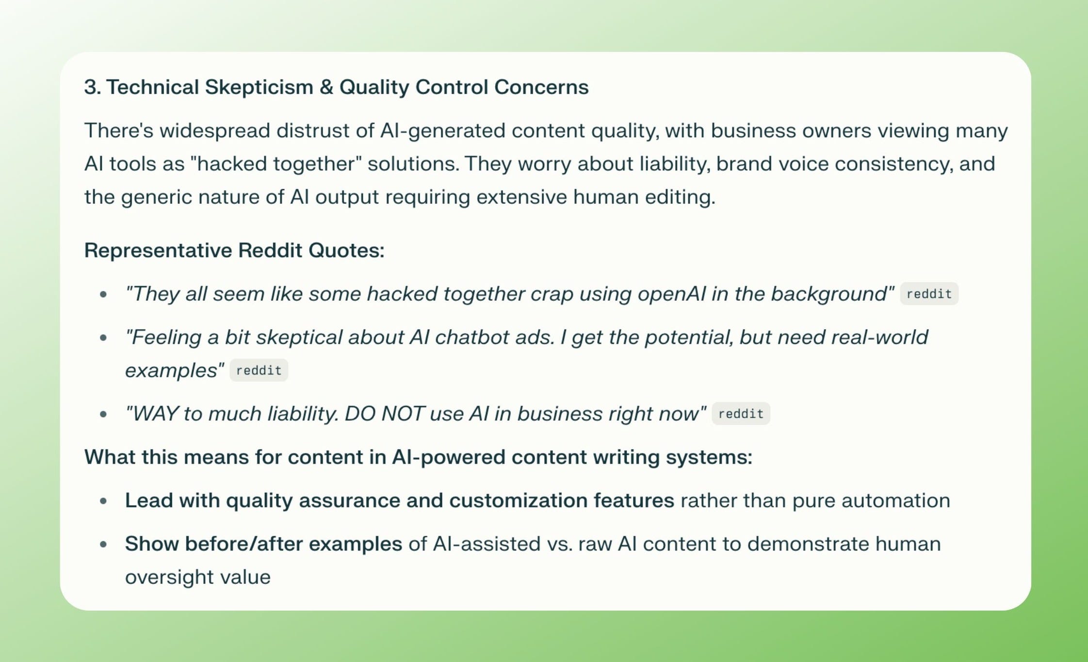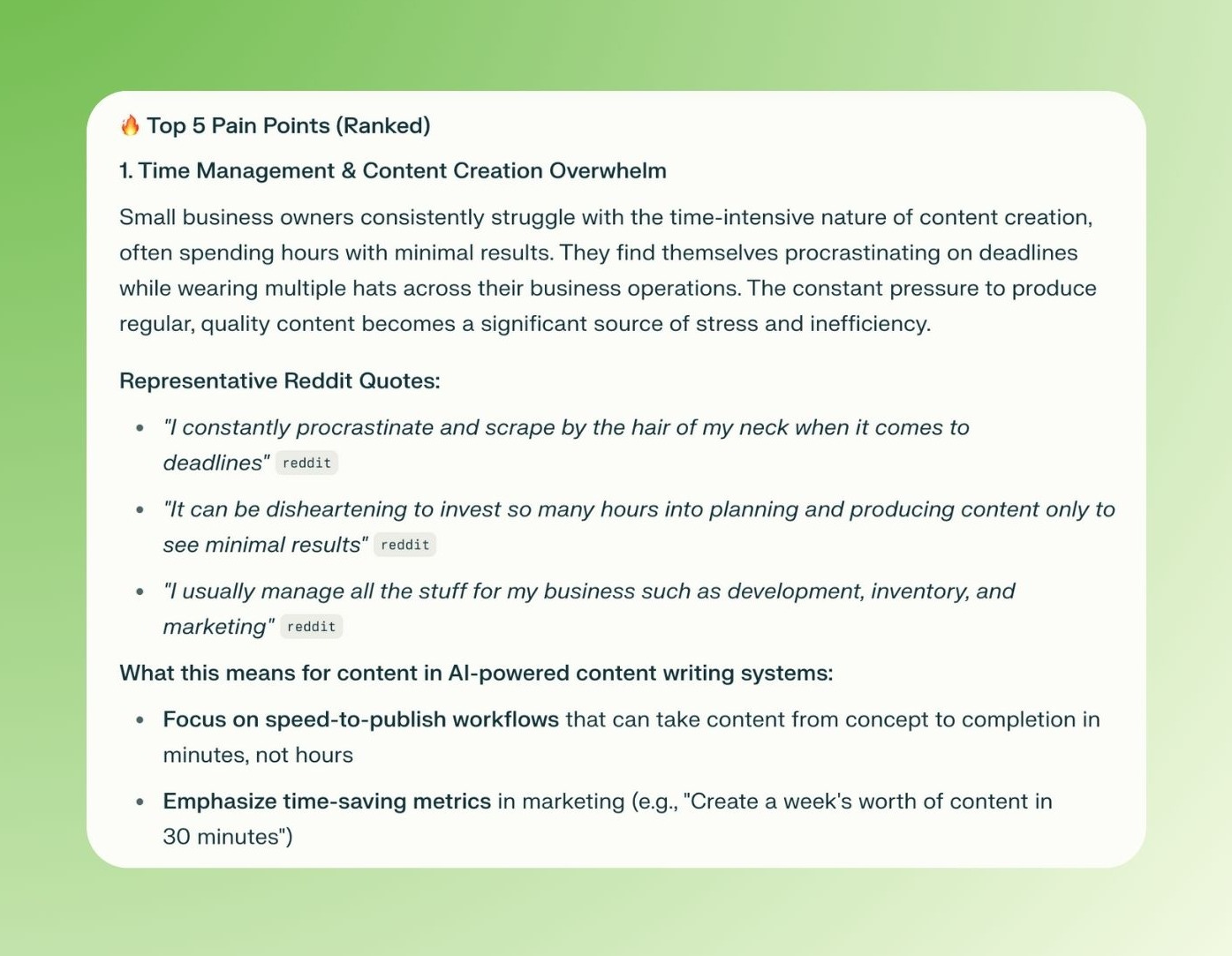 • For each pain point: 2–3 representative Reddit quotes (with subreddit, date, permalinks), and “What this means for content in [NICHE]” (1–2 tactical ideas).