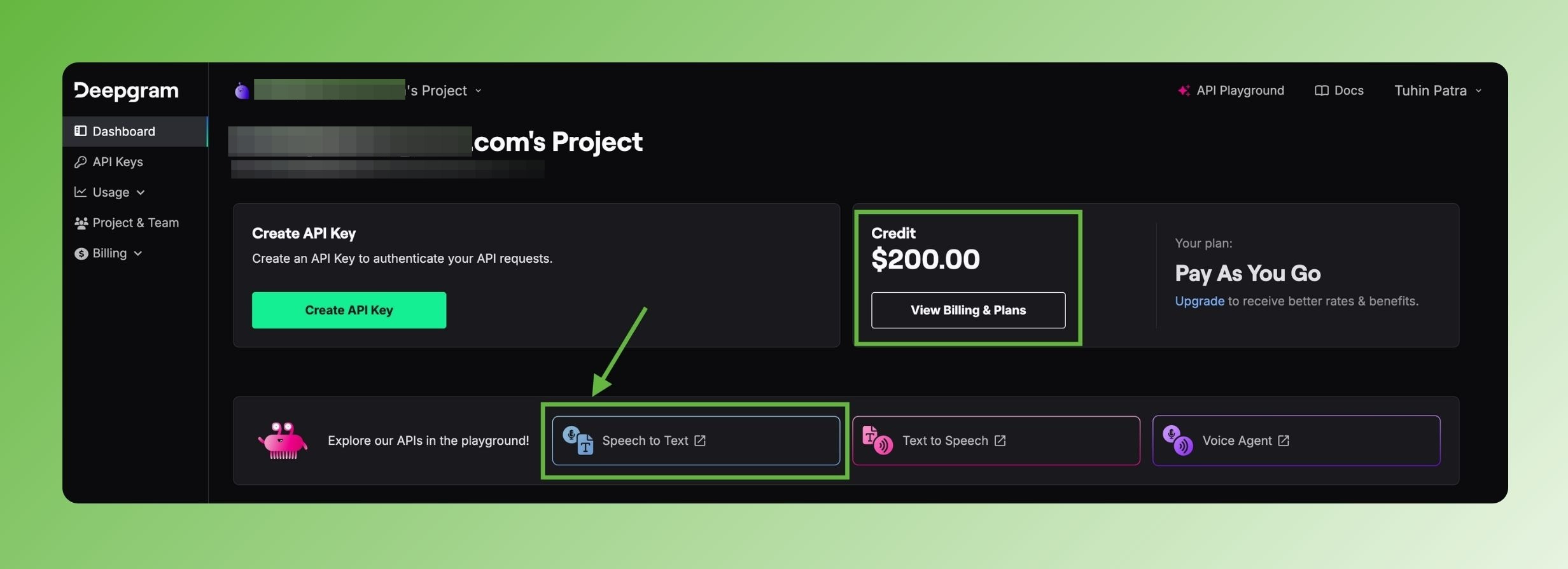 2. Once you log in, verify you’ve got the credits. Next, click on “Speech to Text”.
