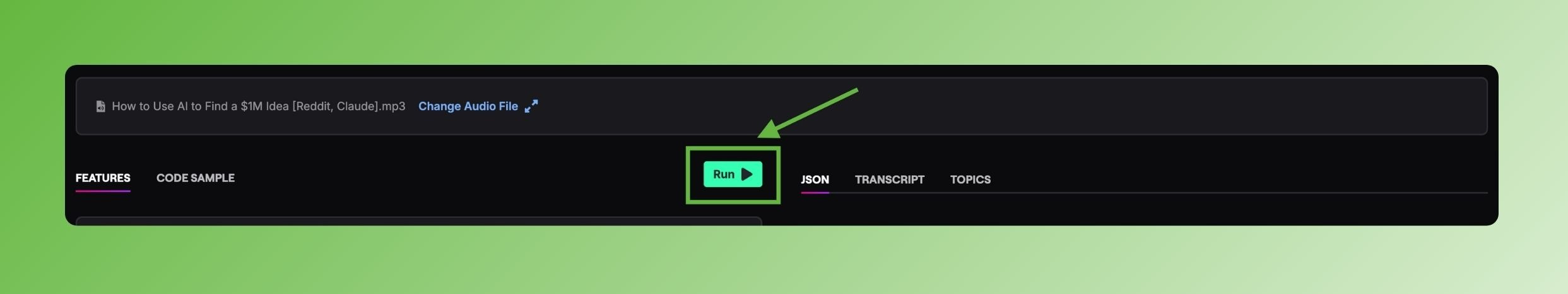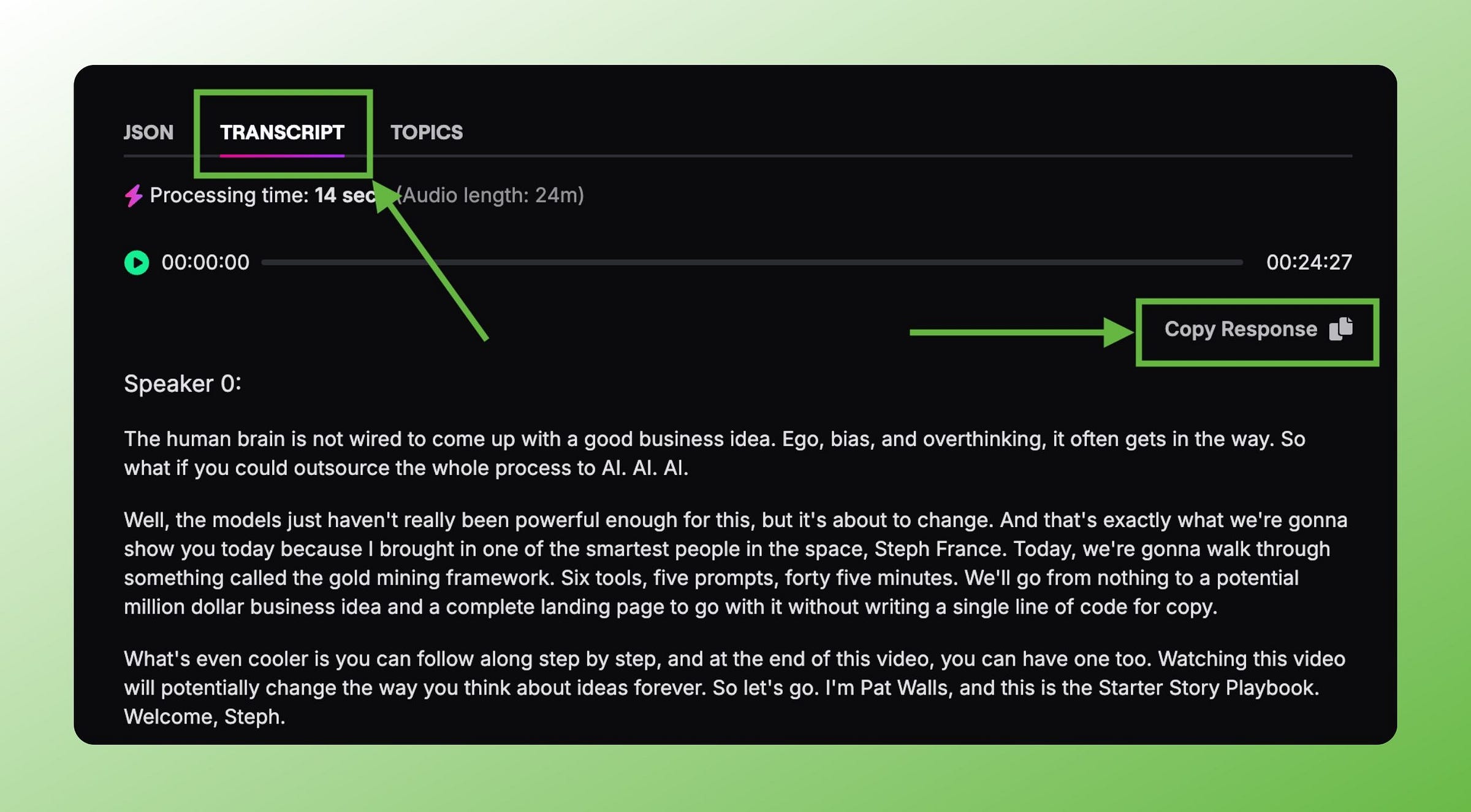 6. After the transcription is complete, go to “Transcript” and click “Copy Response”